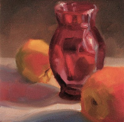 I think perhaps one of the things I am enjoying most about doing these small paintings is experimenting with a palette that I don't normally use. Because I have been primarily a representational landscape painter throughout my career, red is a color I haven't used a great deal. You'll notice is my last number of posts I have been seeing red! Still life is a new subject matter for me; it has never engaged me before now. You can teach an old dog new tricks....(ok, I'm not THAT old). It's a wonderful journey, this painting for a living. Always something you don't know or haven't done. There is an eastern saying "Sell your cleverness and buy bewilderment". That's how I am feeling about now.